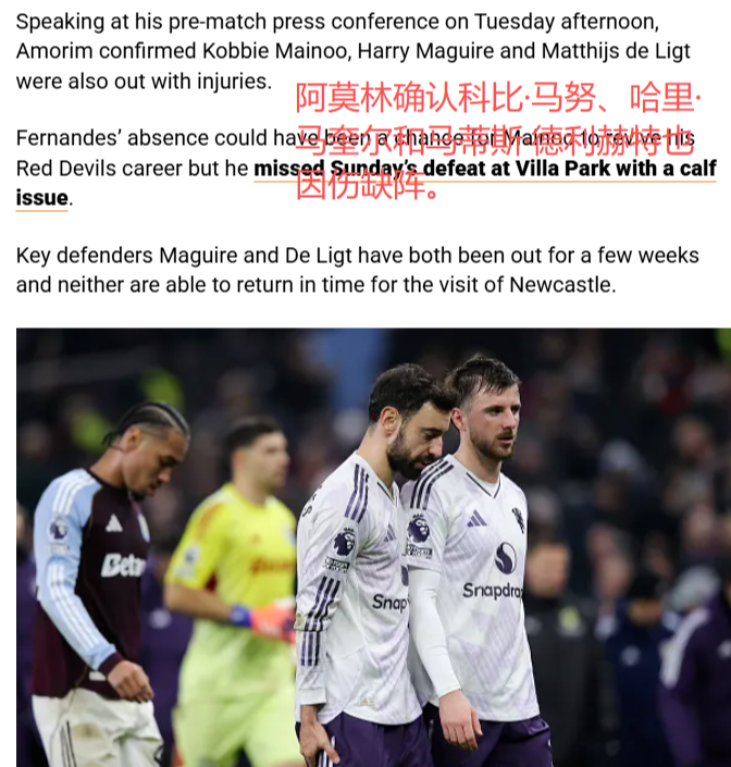 万万想不到,临近比赛却迎来崩盘式伤病潮——球队队长、中场核心布鲁诺-费尔南德斯在对阵维拉的比赛中伤退,确诊软组织损伤大概率缺阵,替补他的科比-梅努也在训练中拉伤小腿,能不能上还是未知数!