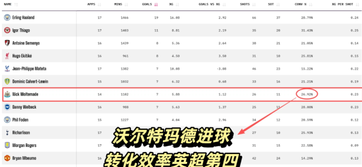现在的喜鹊压根不缺反击利器——吉马良斯本赛季状态火热,拿下5球2助攻,中路时常能够送出精准长传,哪怕是面对顶级边后卫都能强行撕开缺口;锋线的沃尔特玛德更是终结利器,进球转化率26.92%排在英超第四(本赛季在至少打进5球球员中),两人一中一前,直接盘活了纽卡斯尔联的反击体系。哪怕是面对强队,纽卡也能耐住寂寞扎紧篱笆,就等对手犯错打反击。